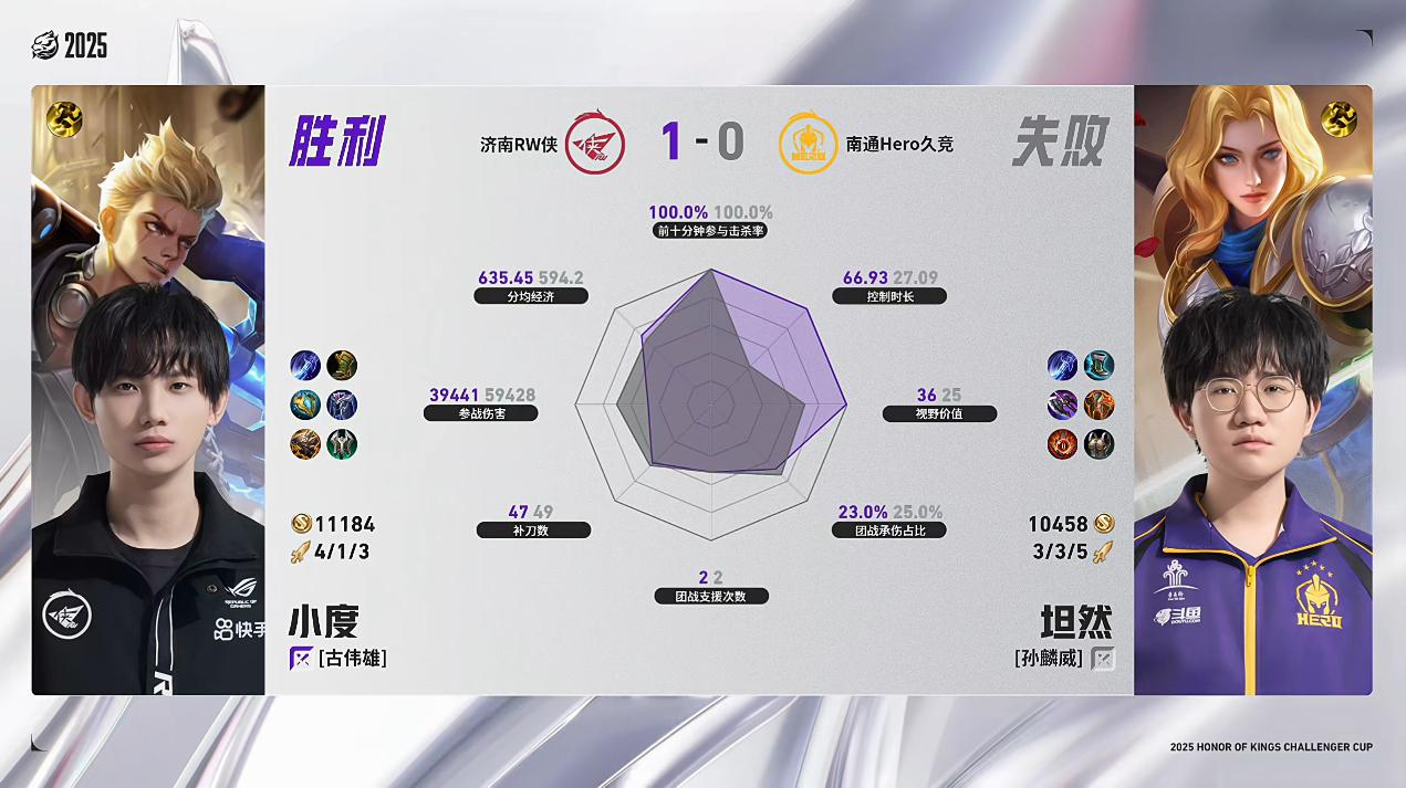 虎撲12月28日訊 RW/Hero第1局數據對比:小俞虞姬全包圍妖刀敖隱。